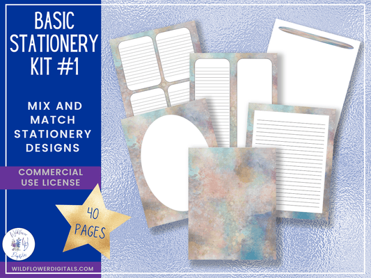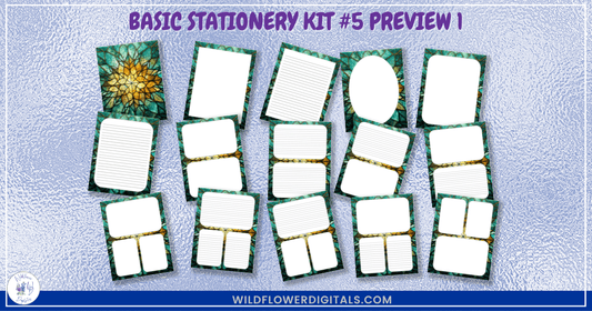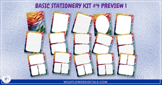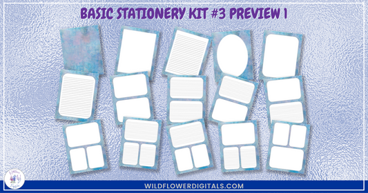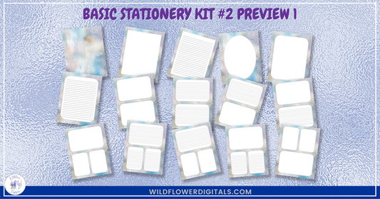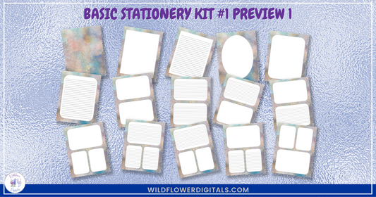 Basic stationery kits include a mix-and-match combination of simple frames and stationery pages with background images, that can be used in journals, planners, workbooks, and other projects.