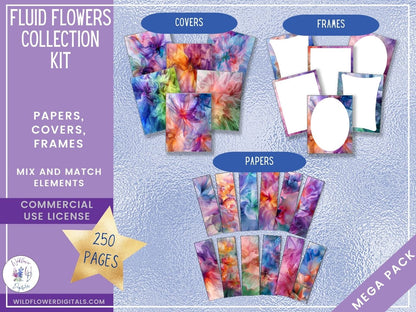 Get the Fluid Flowers Collection Digital Papers along with the coordinating Covers and Frames, and save over 30%! The Kit is an elegant package of delicate flowing flowers in alcohol ink designs with just a hint of gold, and comes with 50 digital papers, 50 covers, and 150 frames — for a total of 250 images — complete with commercial use rights so you can use them for: